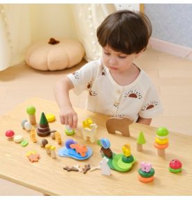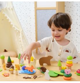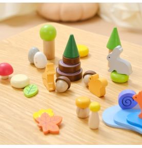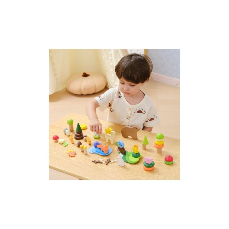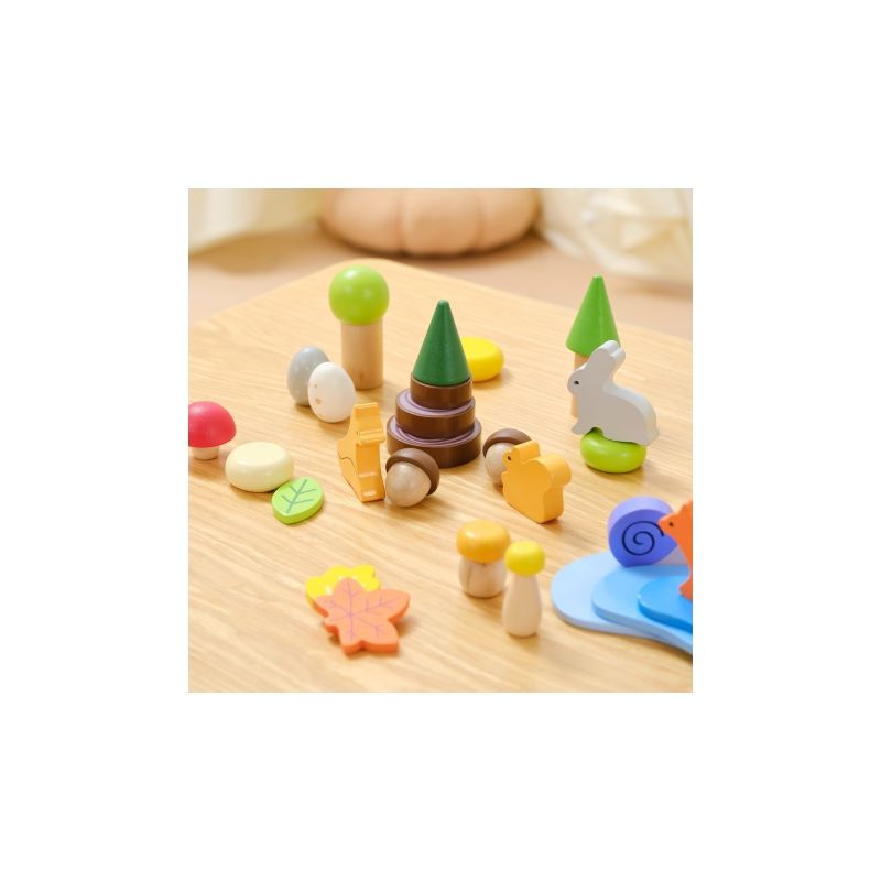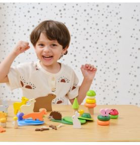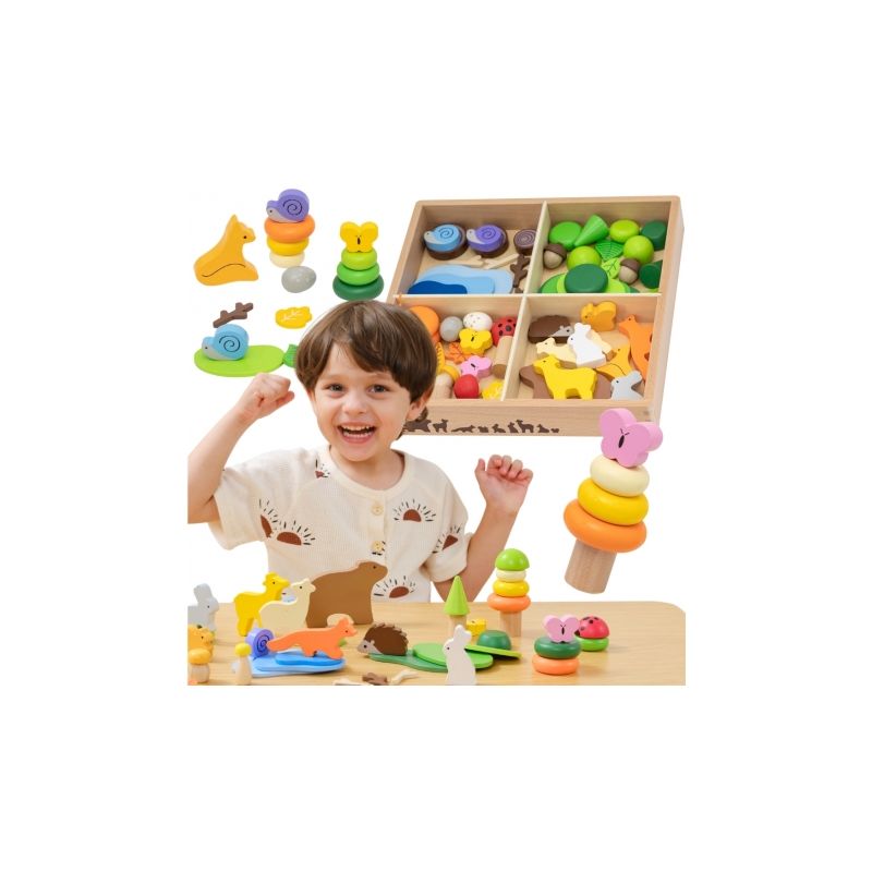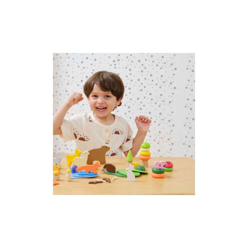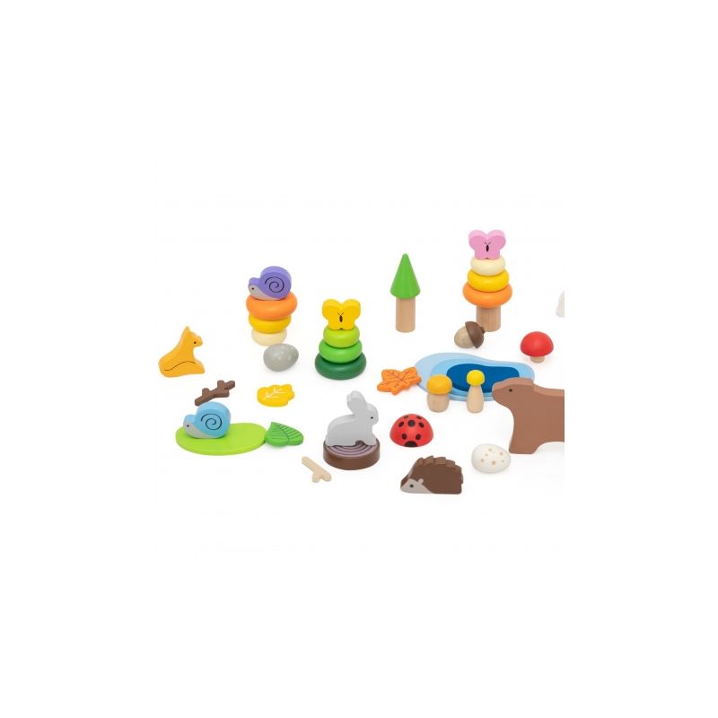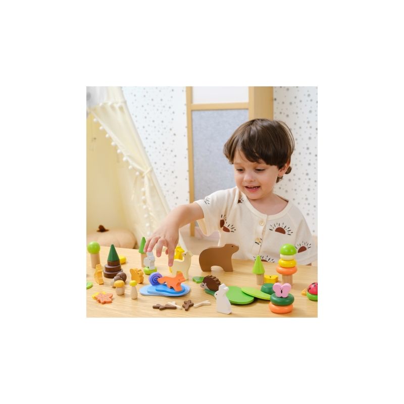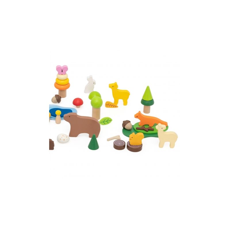 Zestaw 58 drewnianych elementów do tworzenia scenek leśnych, wspierający rozwój kreatywności, wyobraźni, małej motoryki oraz wiedzy o przyrodzie. Idealny dla dzieci od 3 lat.