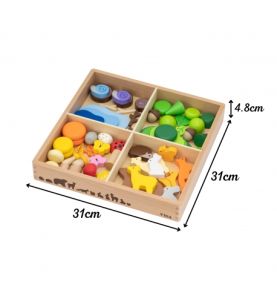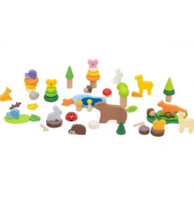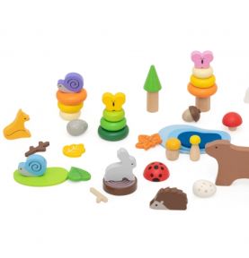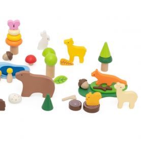• 58 elementów drewnianych: figurki zwierząt i elementy przyrody