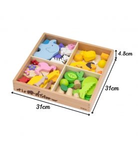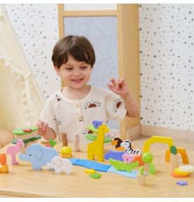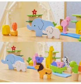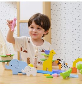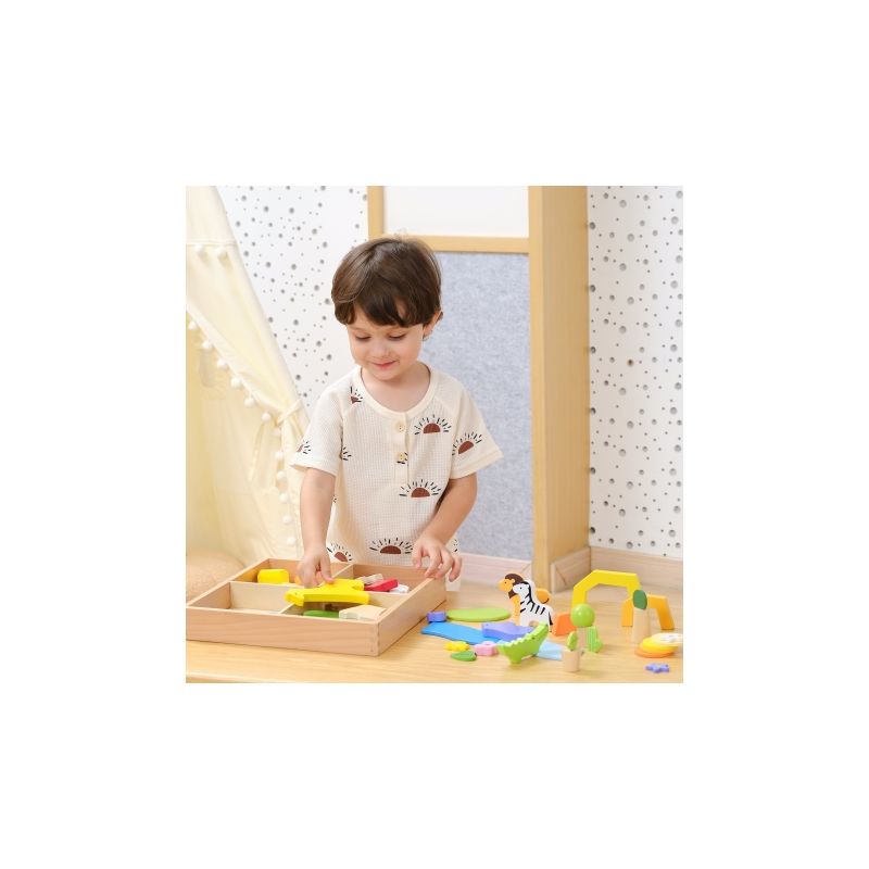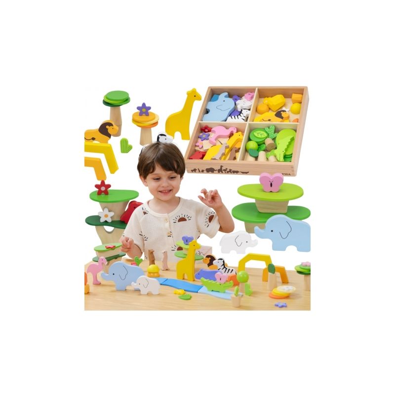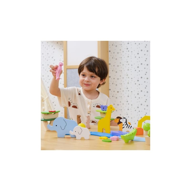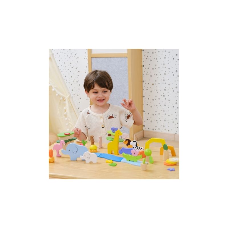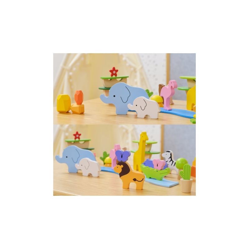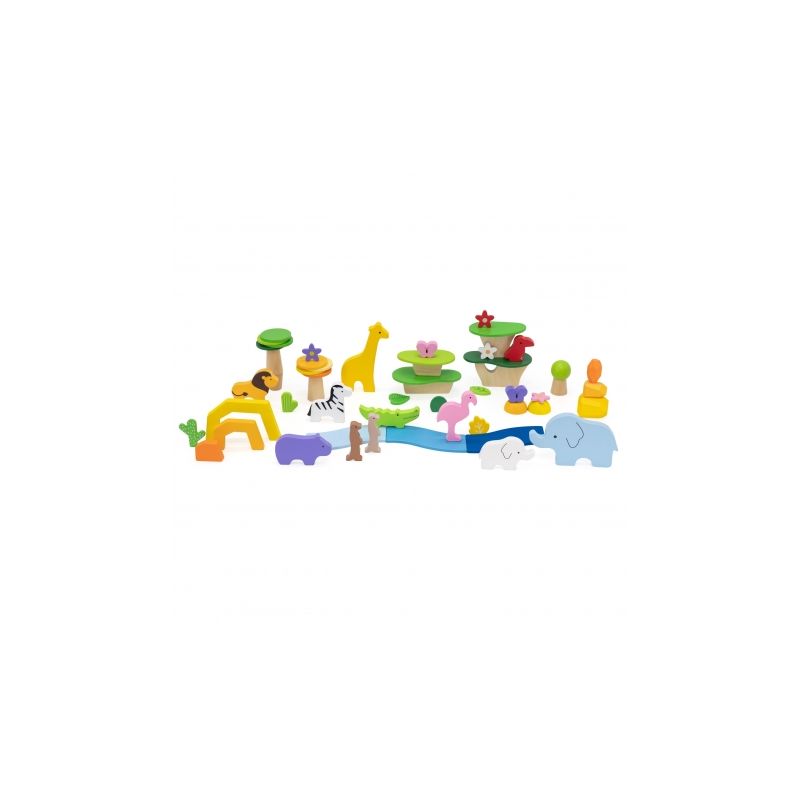 Zestaw 55 drewnianych elementów do zabawy w tropikalnej sawannie. Wspiera rozwój kreatywności, wyobraźni, małej motoryki i wiedzy o zwierzętach egzotycznych. Idealny dla dzieci od 3 lat.