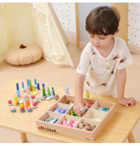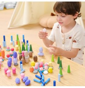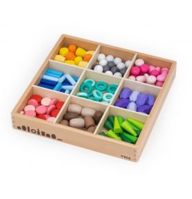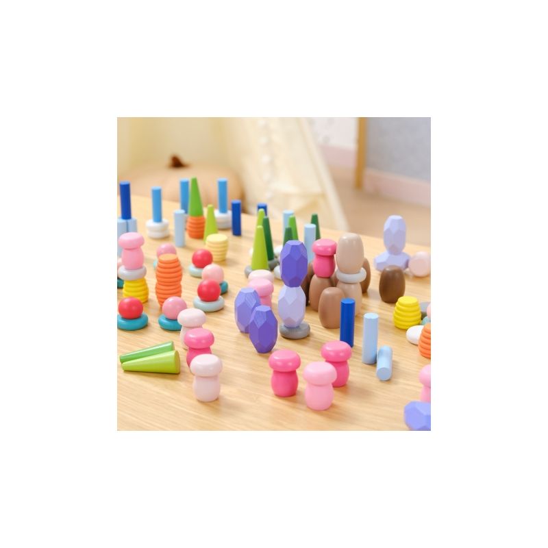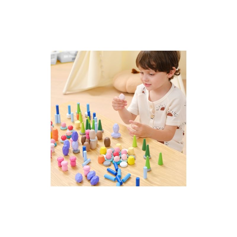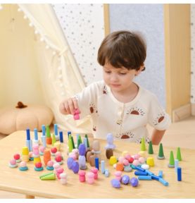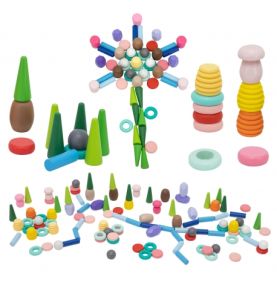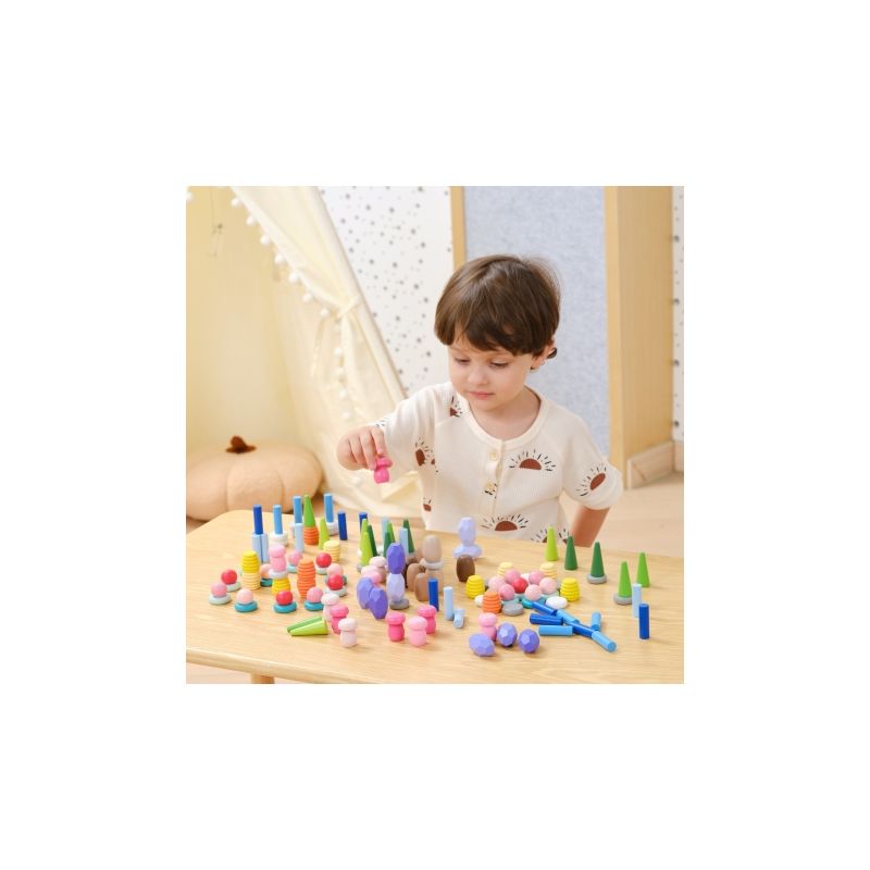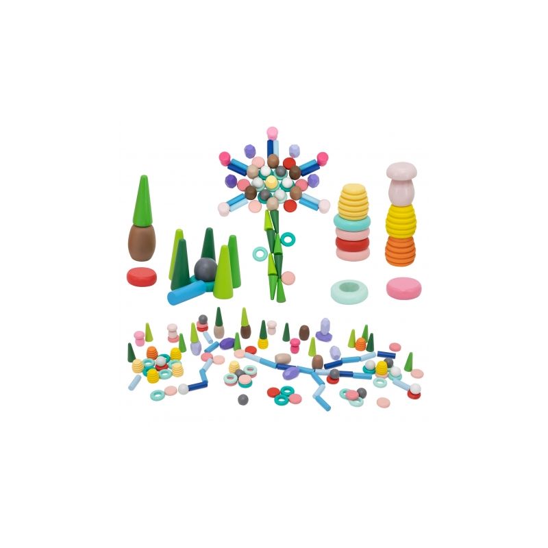 Zestaw 141 drewnianych klocków inspirowanych naturą – grzyby, plastry miodu, kamienie, stożki i pierścienie. Otwarta forma zabawy rozwija kreatywność, wyobraźnię, zdolności manualne oraz koncentrację. Idealny do zabawy sensorycznej i artystycznej, wspiera także rozwój społeczny.