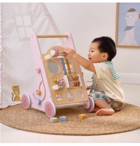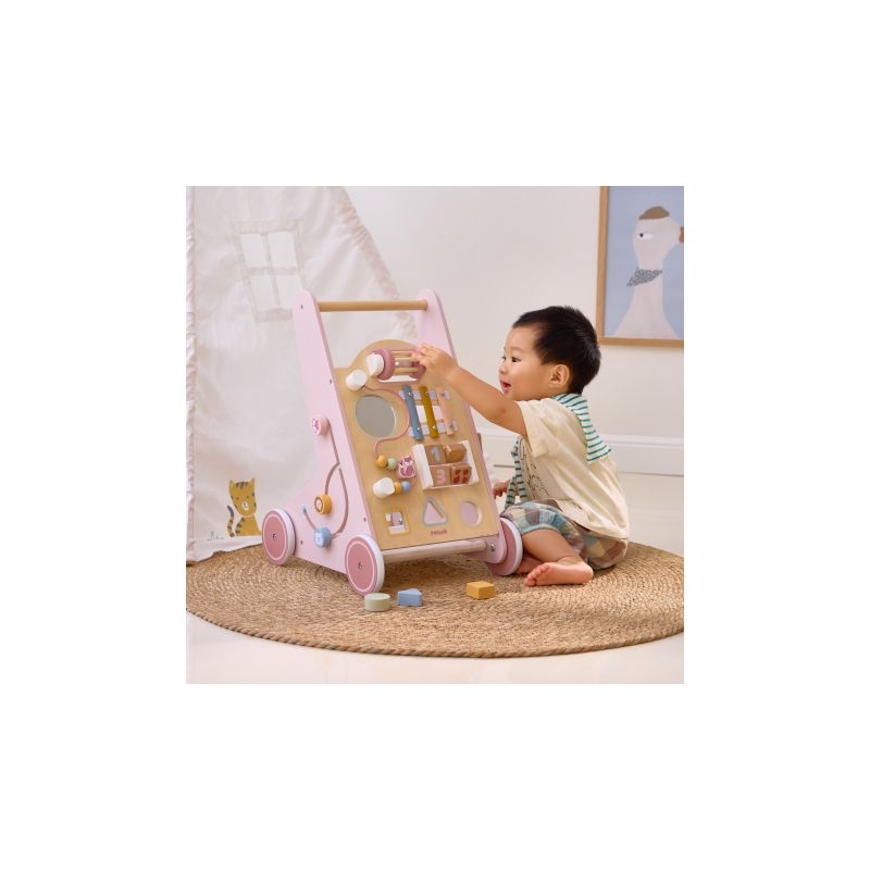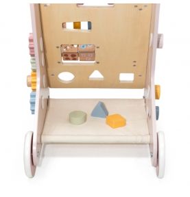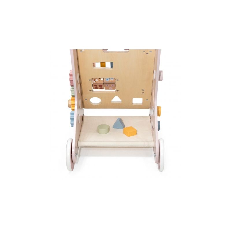Interaktywny chodzik dla dzieci od 18 miesiąca życia. Wspiera naukę chodzenia, oferuje zabawę klockami, cymbałkami, lusterkiem i sorterem kształtów. Posiada praktyczny schowek, rozwija dużą motorykę, koordynację ręka-oko, rozpoznawanie kształtów i słuch muzyczny.