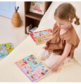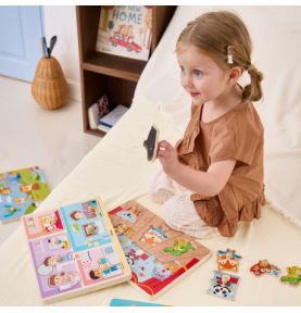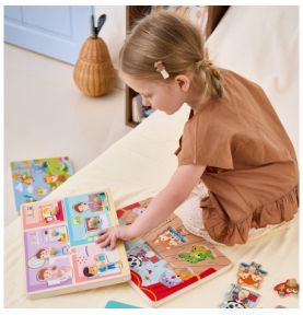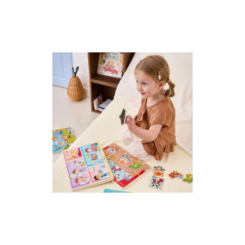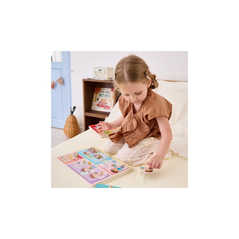 VIGA Puzzle Dźwiękowe to interaktywna układanka, która wprowadza dziecko w świat codziennych czynności. Po podniesieniu i dopasowaniu elementu maluch usłyszy realistyczny dźwięk przedstawiający takie aktywności jak gotowanie, sprzątanie czy mycie zębów. Zabawka wspiera rozwój zdolności poznawczych, manualnych oraz pomaga w nauce codziennych rutyn i samodzielności.