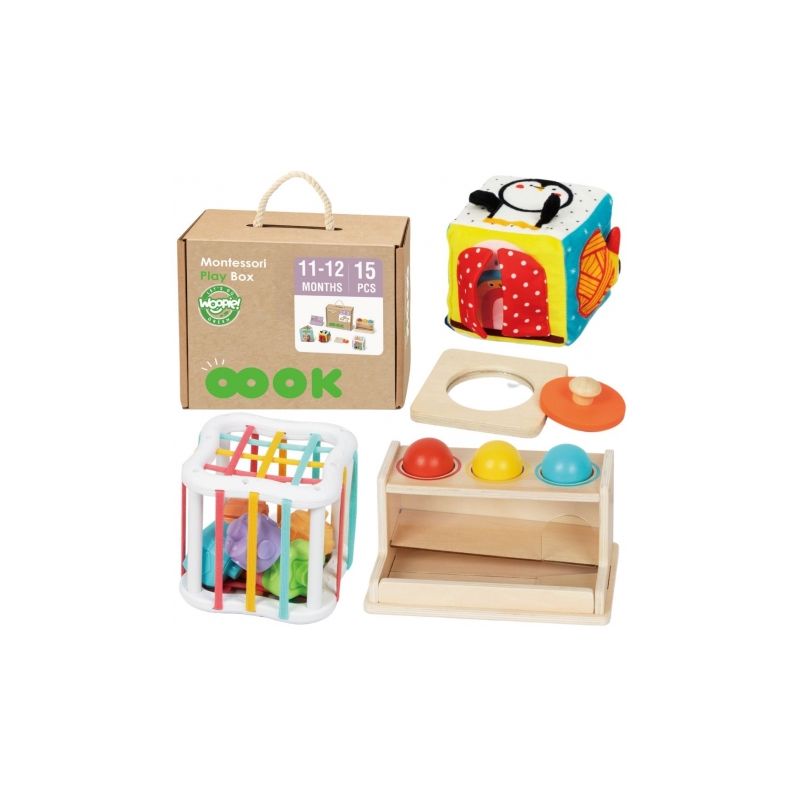 Odkryj niezwykłe Pudełko Edukacyjne WOOPIE GREEN dla niemowląt 11–12 miesięcy! Zestaw 5 zabawek sensorycznych w duchu Montessori wspiera rozwój psychomotoryczny, koordynację ręka–oko, logiczne myślenie oraz kreatywność dziecka. W zestawie znajduje się również poradnik dla rodziców, który ułatwia zabawę i naukę.